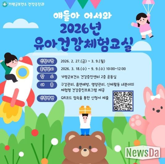 뉴스다 최광묵 기자 | 가평군보건소는 어린이집과 유치원을 대상으로 신청을 받아 체험형 ‘유아건강체험교실’을 3월 18일부터 9월까지 매주 수요일 운영한다.