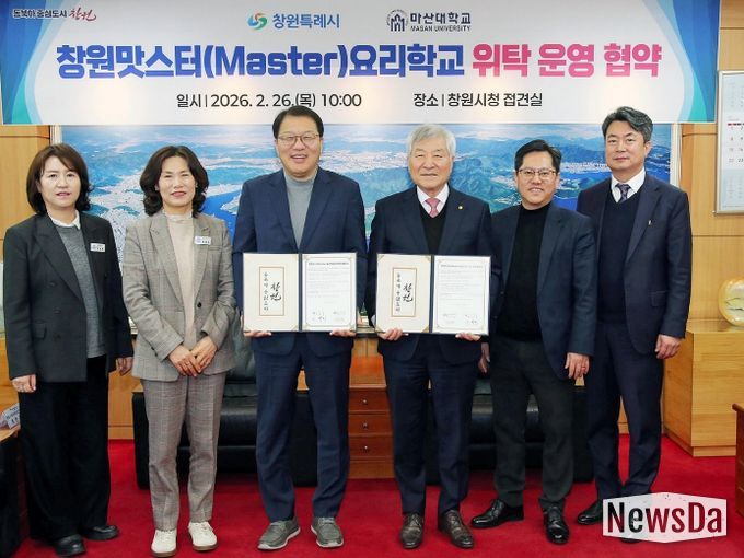 뉴스다 최광묵 기자 | 창원특례시는 2월 26일 시청 접견실에서 마산대학교와 '창원맛스터(Master)요리학교 위탁운영 업무협약'을 체결하고, 향후 3년간 지역 외식업 경쟁력 강화를 위한 전문인력 양성 사업을 추진한다.