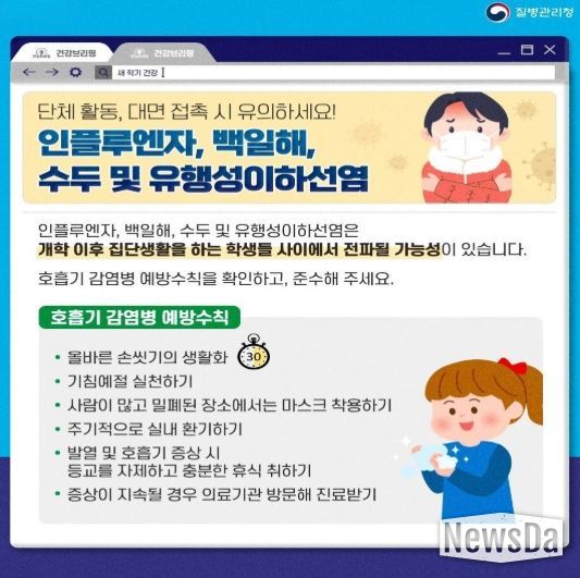 뉴스다 최광묵 기자 | 고양특례시 일산서구보건소는 새학기를 맞아 학교·학원 등 집단생활이 본격화되면서 인플루엔자, 백일해, 수두 및 유행성 이하선염 등 유행성 감염병 발생 위험이 높아질 수 있다며 각별한 주의를 당부했다.
