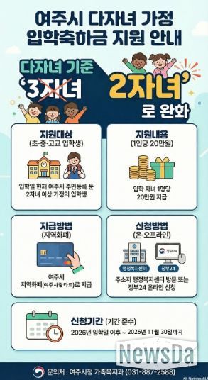 뉴스다 최광묵 기자 | 여주시는 저출산 극복과 양육 부담 경감을 위해 다자녀 가정 기준을 3자녀 이상에서 2자녀 이상으로 확대하고 오는 3월부터 다자녀 가정 입학축하금 지원 신청을 받는다고 밝혔다.
