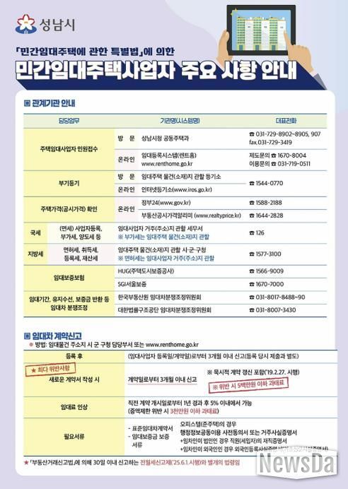 뉴스다 최광묵 기자 | 성남시는 잦은 법령 개정과 제도 변화로 혼란을 겪는 지역 임대사업자를 지원하기 위해 ‘등록 임대사업자 주요 준수사항’ 안내문을 제작해 발송할 예정이라고 밝혔다.