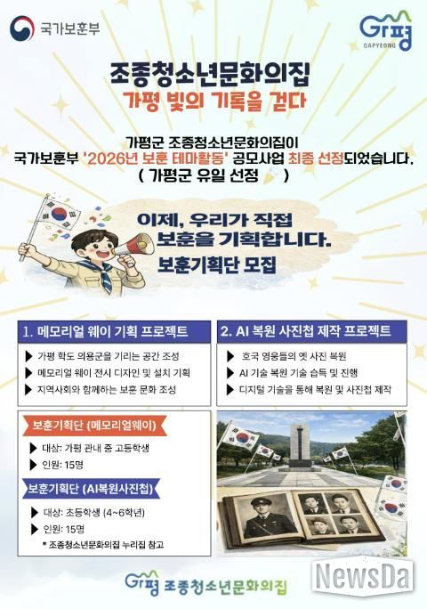 뉴스다 최광묵 기자 | 가평군 조종청소년문화의집이 국가보훈부가 주최한 ‘2026년 보훈 테마활동’ 공모사업에 최종 선정됐다. 이번 공모에서는 전국 81개 청소년수련시설이 선정됐으며, 가평군에서는 조종청소년문화의집이 유일하게 이름을 올렸다.