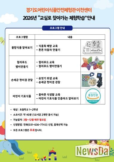 뉴스다 최광묵 기자 | 어린이식품안전체험관 이천센터에서는 3월부터 12월까지 관내 초등 새내기 및 저학년 어린이들을 대상으로 ‘교실로 찾아가는 체험학습’ 프로그램을 진행한다.