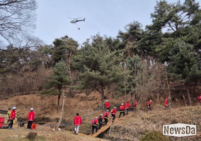 이번 훈련에는 총 70여 명의 인원과 산불 진화차 2대, 소방차 1대, 구급차 1대, 헬기 1대 등 다양한 장비가 동원되어 실전과 매우 유사한 강도 높은 훈련이 펼쳐졌다.