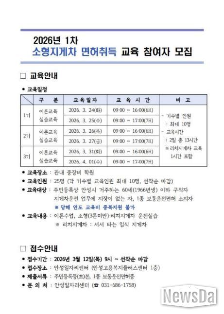뉴스다 최광묵 기자 | 안성시는 2026년 맞춤형 취업지원 교육의 일환으로 오는 3월 12일부터 ‘1차 소형지게차 면허취득 교육’에 참여할 교육생을 모집한다.