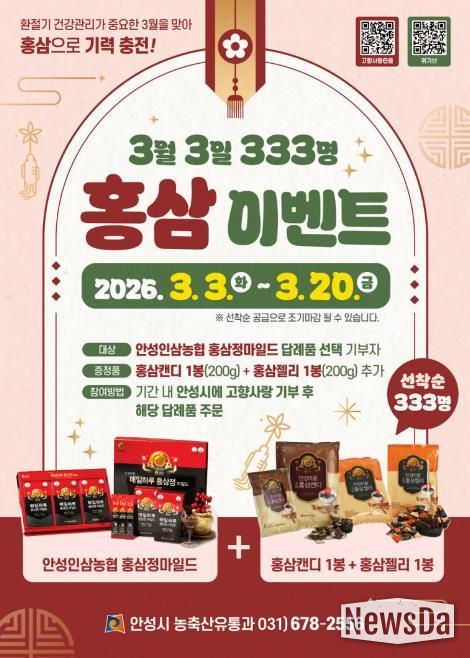 뉴스다 최광묵 기자 | 안성시는 환절기 건강관리가 중요한 3월을 맞아 고향사랑기부 ‘3월 3일 333명 홍삼 이벤트’를 3월 3일부터 20일까지 추진한다고 밝혔다.