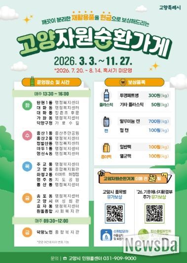 뉴스다 최광묵 기자 | 고양특례시는 시민들의 올바른 분리배출 실천을 유도하고 고품질 재활용 문화 확산을 위해 자원순환가게 운영을 오는 3월 3일부터 시작한다고 밝혔다.