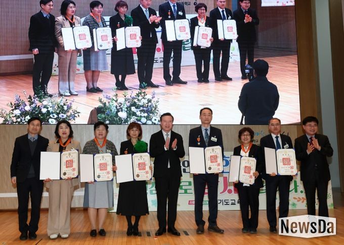 뉴스다 최광묵 기자 | 경기도교육청이 27일 경기과학고등학교 대강당에서 퇴직 교원 727명을 대상으로 훈․포장과 표창장 전수식을 거행했다. 오랜 기간 학생 교육을 위해 헌신한 퇴직 교원들의 노고를 기리고, 존경과 감사를 표하기 위해 마련한 자리다.