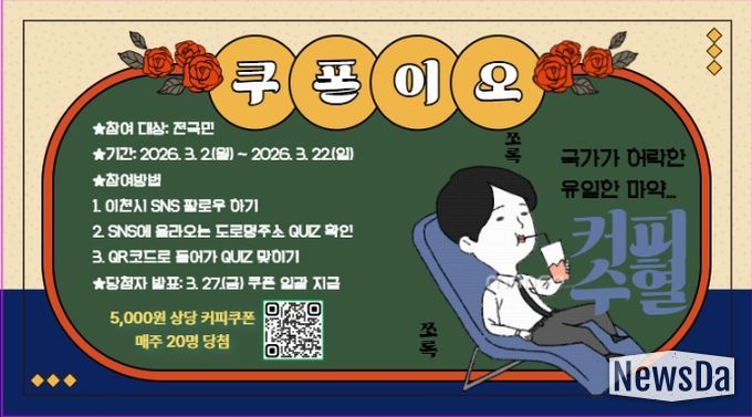 도로명주소 온라인 퀴즈 이벤트는 오는 3월 2일부터 3월 22일까지 3주간 진행되며 이천시 사회관계망서비스(SNS) 채널을 통해 누구나 참여할 수 있고 정답자 중 추첨을 통해 5,000원 상당 커피 쿠폰(60명)을 증정할 예정이다.