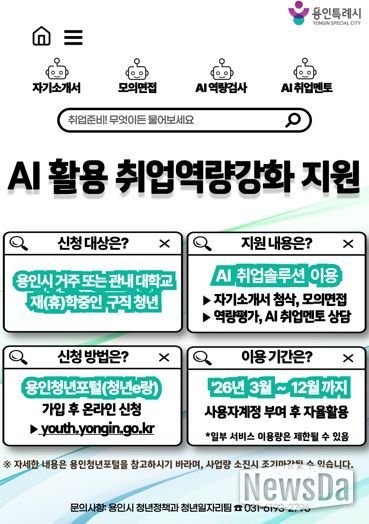 뉴스다 최광묵 기자 | 용인특례시는 인공지능(AI)을 활용한 취업역량강화 지원사업에 참여할 청년 구직자를 모집한다고 2일 밝혔다.