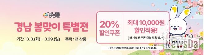 뉴스다 최광묵 기자 | 경상남도와 (재)경상남도투자경제진흥원이 운영하는 e경남몰이 3월 3일부터 예산 소진 시까지 ‘2026년 봄맞이 할인 기획전’을 진행한다.