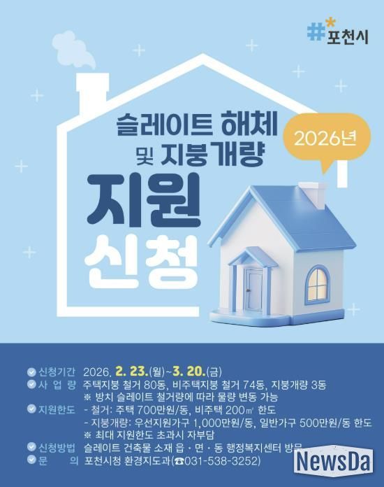 뉴스다 최광묵 기자 | 포천시는 시민의 건강을 위협하는 석면 비산 위험을 예방하고 안전한 생활환경을 조성하기 위해 ‘2026년 슬레이트 처리 및 지붕 개량 지원사업’을 본격 추진한다.