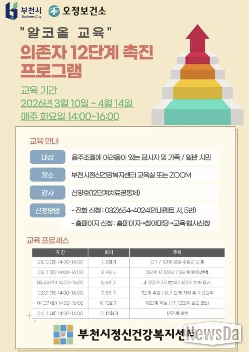 뉴스다 최광묵 기자 | 부천시는 부천시정신건강복지센터와 함께 음주 조절에 어려움을 겪는 시민의 회복을 지원하기 위해 3월 10일부터 4월 14일까지 매주 화요일 ‘의존자 12단계 촉진’을 주제로 알코올 교육을 진행한다.