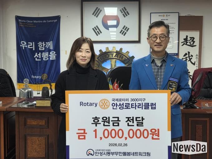뉴스다 최광묵 기자 | 안성시동부무한돌봄네트워크팀은 지난 26일 국제로타리 3600지구 안성로타리클럽으로부터 촘촘한 복지 안전망 구축을 위한 후원금 100만 원을 전달받았다.