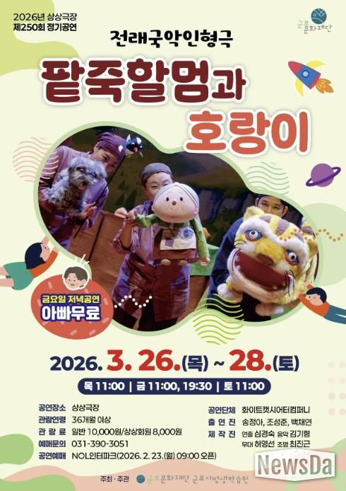 뉴스다 최광묵 기자 | 군포문화재단 군포시평생학습원 상상극장은 2026년 정기공연의 첫 작품으로 전래국악 인형극〈팥죽할멈과 호랑이〉를 선보인다. 이번 공연은 오는 3월 26일부터 28일까지 상상극장에서 개최된다.
