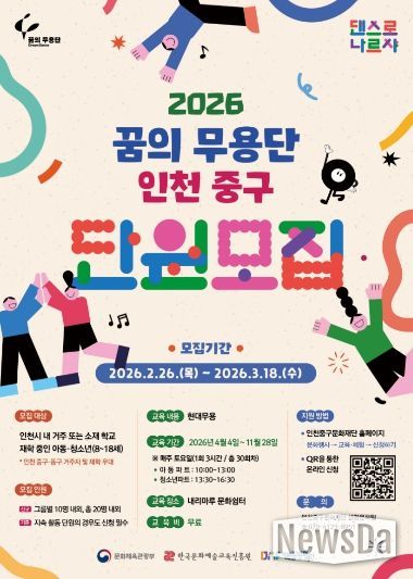 뉴스다 최광묵 기자 | (재)인천중구문화재단(이사장 김정헌)은 2026 꿈의 무용단 ‘인천 중구’의 신규 단원을 모집한다고 4일 밝혔다.