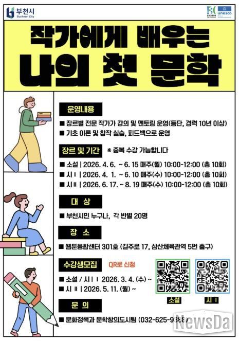 교육은 웹툰융합센터 301호에서 진행되며, 부천시민을 대상으로 반별 20명을 선착순 모집한다. 1기 소설과 시 과정 신청은 3월 9일부터, 2기 시 과정 신청은 5월 11일부터다.