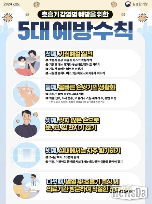 또한 ▲인플루엔자 예방접종 ▲기침예절 실천 ▲올바른 손씻기 생활화 ▲씻지 않은 손으로 눈·코·입 만지지 않기 ▲실내 자주 환기하기 ▲발열 및 호흡기 증상 시 의료기관 방문 등 호흡기 감염병 예방수칙을 철저히 지켜 줄 것을 강조했다.