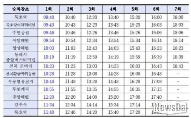 이에 따라 3월 7일부터는 묵호역 기준 오전 9시 40분에 1회차 운행이 시작되며, 수변공원, 망상해변, 무릉별유천지 등 주요 거점 정류장의 도착 시간도 10분씩 빨라진다.