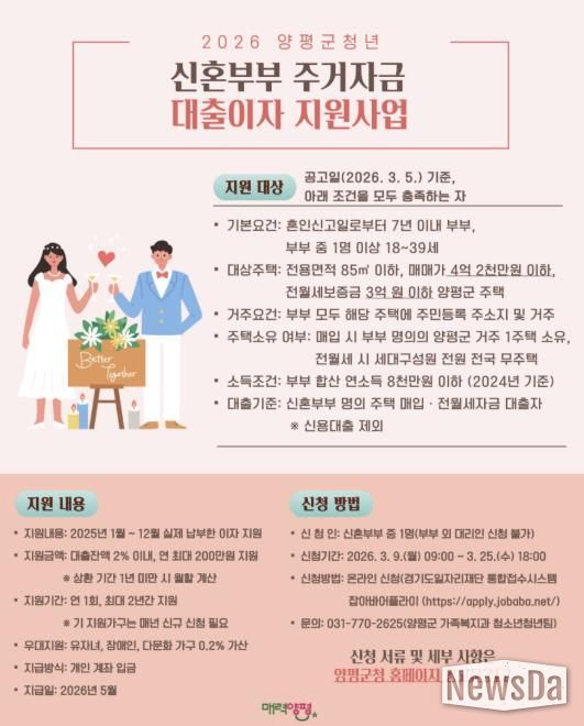 뉴스다 최광묵 기자 | 양평군은 주택 매입 또는 임차(전월세) 자금 대출을 받은 양평군 거주 청년 신혼부부를 대상으로 연간 최대 200만 원의 대출이자를 지원하는 ‘2026년 양평군 청년 신혼부부 주거자금 대출이자 지원 사업’을 시행한다고 5일 밝혔다.