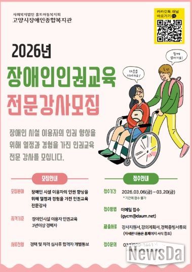 뉴스다 최광묵 기자 | 고양시장애인종합복지관이 2026년 고양시 장애인시설 이용자 인권교육 수행기관으로 선정됐다고 5일 밝혔다.