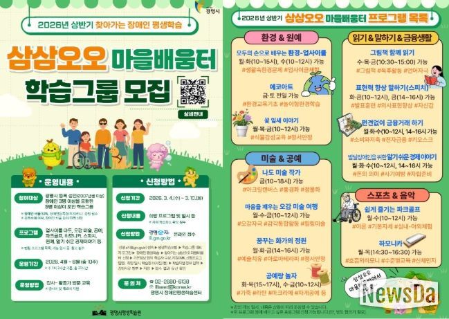 윤영희 평생학습원장은 “삼삼오오 마을배움터는 장애인의 실제 생활권 내 학습 수요를 반영한 수요자 중심의 프로그램”이라며 “앞으로도 장애인의 학습 접근성을 높여 누구나 배움에 참여할 수 있는 보편적 평생학습 환경을 지속적으로 확대하겠다”고 밝혔다.