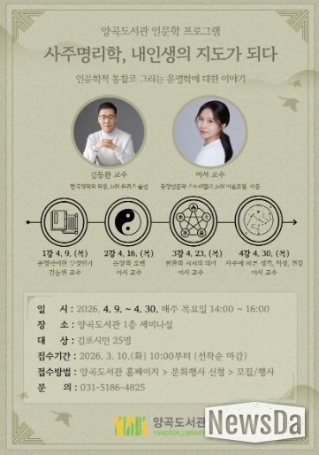 뉴스다 최광묵 기자 | 김포시 양곡도서관은 오는 4월 9일부터 4월 30일까지 매주 목요일, 인문학 강좌 '사주명리학, 내 인생의 지도가 되다'를 운영한다.