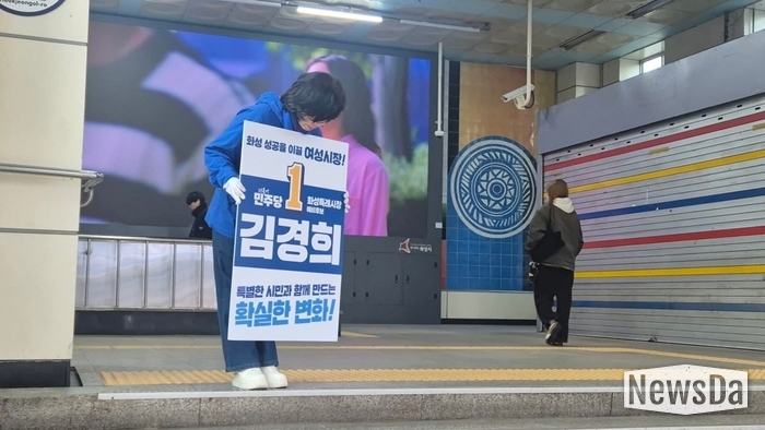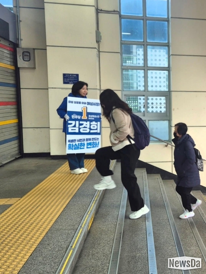 ▲병점역 아침 출근 인사를 하는 김경희 화성시장 예비후보(사진제공= 김경희 선거사무소)