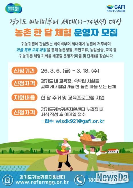뉴스다 최광묵 기자 | 경기도와 경기도농수산진흥원은 ‘경기도 베이비부머 농촌 한 달 체험’을 운영할 마을·단체 2곳을 오는 18일까지 모집한다.