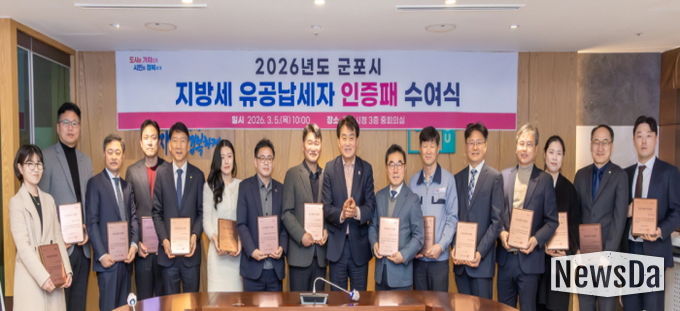 뉴스다 최광묵 기자 | 군포시 하은호 시장은 3월 5일 지방세를 성실하게 납부하여 지방재정 확충에 기여한 유공납세자 15개 법인에게 ‘유공납세자 인증패’를 수여하고 감사의 마음을 전했다.