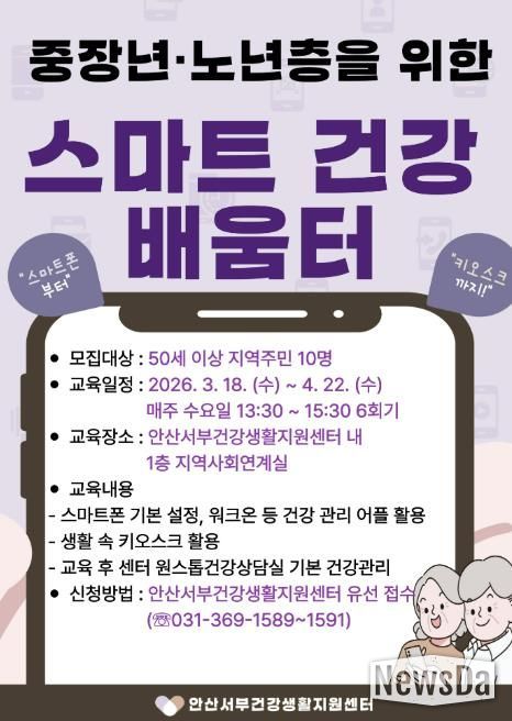 뉴스다 최광묵 기자 | 안산시는 단원보건소 서부건강생활지원센터는 오는 18일부터 ‘중장년‧노년층을 위한 스마트 건강 배움터’를 운영한다고 6일 밝혔다.