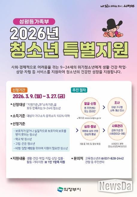 뉴스다 최광묵 기자 | 의정부시는 3월 9일부터 27일까지 ‘2026년 청소년 특별지원’ 사업 대상자를 모집한다.