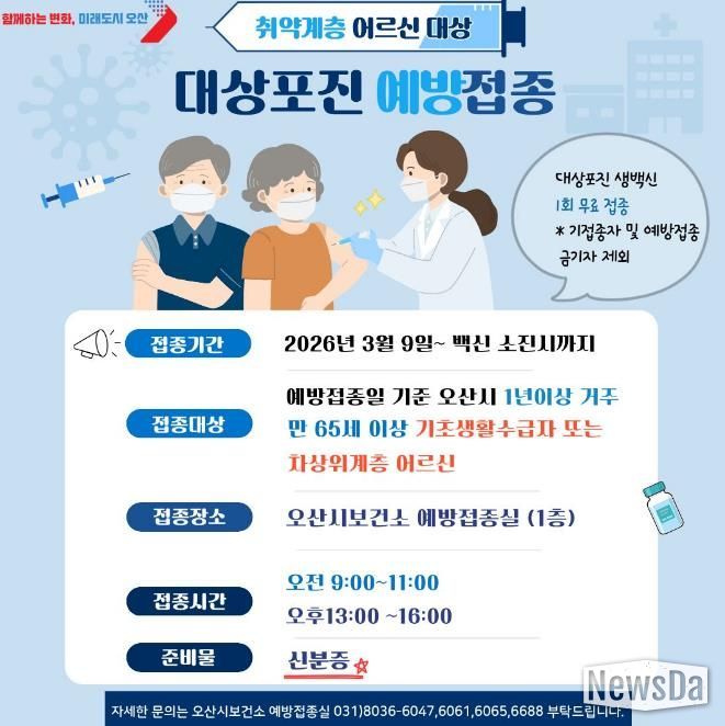 뉴스다 최광묵 기자 | 오산시보건소는 오는 3월 9일부터 백신 소진 시까지 관내 65세 이상 취약계층 어르신을 대상으로 대상포진 무료 예방접종을 시행한다고 밝혔다.