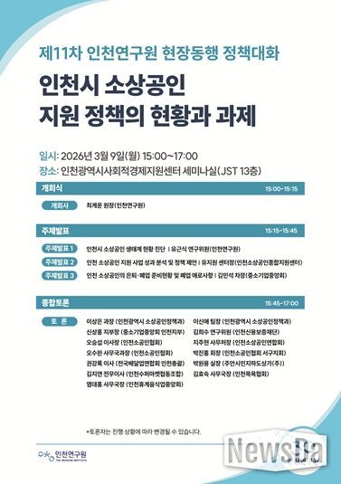 뉴스다 최광묵 기자 | 인천연구원은 2026년 3월 9일 오후 3시 인천광역시사회적경제지원센터 세미나실에서 “인천시 소상공인 지원 정책의 현황과 과제”라는 주제로 '제11차 현장동행 정책대화'를 개최한다.