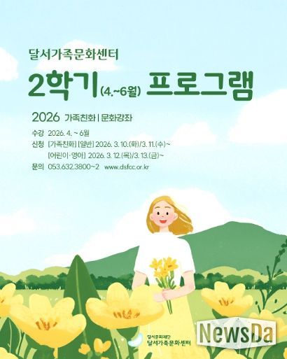 뉴스다 최광묵 기자 | 대구 달서구 달서가족문화센터는 2026년 2학기(4~6월) 문화강좌 수강생을 오는 3월 10일부터 모집한다.