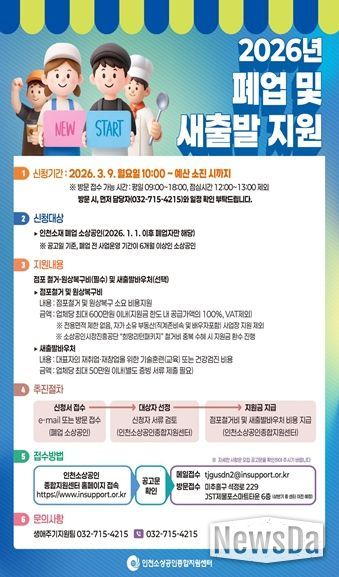 뉴스다 최광묵 기자 | 인천광역시는 고환율·고물가 등 경영 여건 악화로 폐업한 소상공인의 부담을 완화하고 성공적인 재취업과 재창업을 지원하기 위해 ‘폐업 및 새출발 지원’을 추진한다고 밝혔다.
