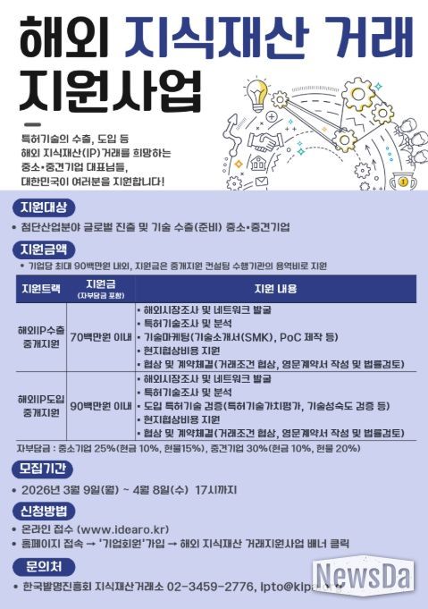 뉴스다 최광묵 기자 | 지식재산처는 3월 9일~4월 8일까지 2026년 ‘해외 지식재산 거래 지원 사업’ 참여 기업을 신규 모집한다고 밝혔다.