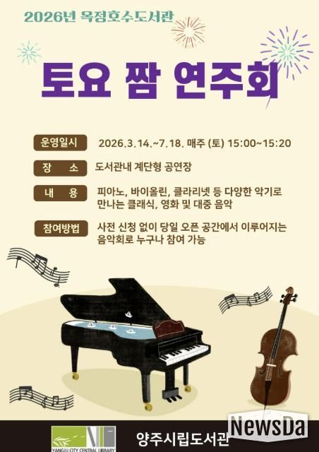 뉴스다 최광묵 기자 | 양주시 옥정호수도서관이 오는 3월 14일부터 7월 18일까지 시민들이 일상 속에서 음악을 즐길 수 있도록 ‘토요 짬 연주회’를 진행한다.