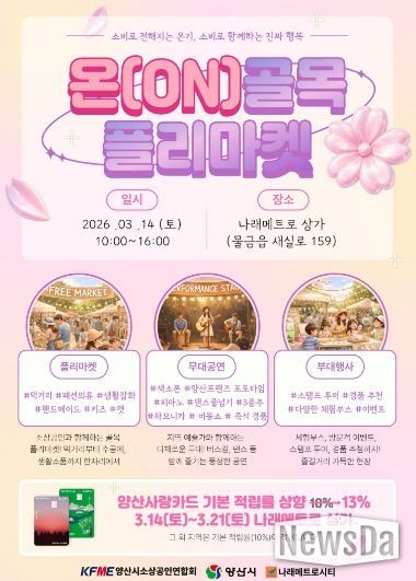 뉴스다 최광묵 기자 | 양산시 소상공인연합회(회장 우현욱)에서 골목상권 활성화와 지역 상인들의 판로 확대를 위해‘온(ON)골목 플리마켓’을 3월 14일(토) 나래메트로시티 상가(양산시 골목형상점가 1호), 3월 21일 덕계무지개상점가(양산시 골목형상점가 2호) 인근 덕계2임시 공영주차장에서 개최한다고 밝혔다.