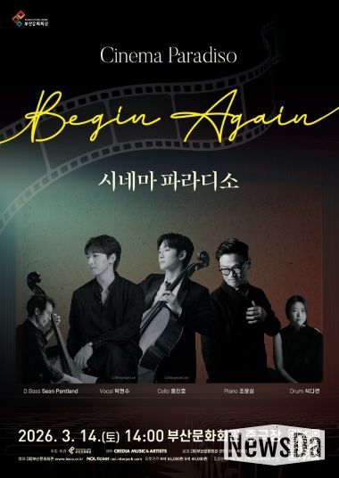 뉴스다 최광묵 기자 | (재)부산문화회관(대표이사 차재근)은 오는 3월 14일 오후 2시, 부산문화회관 중극장에서 영화음악 클래식 공연 ‘시네마 파라디소 '비긴 어게인(Begin Again)'’을 선보인다.