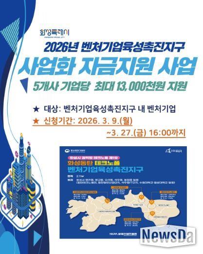 뉴스다 최광묵 기자 | 화성특례시와 화성산업진흥원(원장 전병선)은 화성동탄테크노폴 벤처기업육성촉진지구 내의 벤처기업의 성장을 지원하기 위해‘2026년 벤처기업육성촉진지구 사업화 자금지원 사업’ 참여기업을 오는 3월 27일까지 모집한다.
