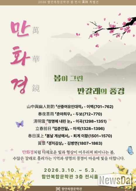 뉴스다 최광묵 기자 | 함안군은 3월 10일부터 5월 3일까지 함안복합문학관 3층 전시홀에서 2026 봄 한시(漢詩) 특별전 ‘만화경(萬華鏡) – 봄이 그린 만 갈래의 풍경’을 개최한다고 밝혔다.