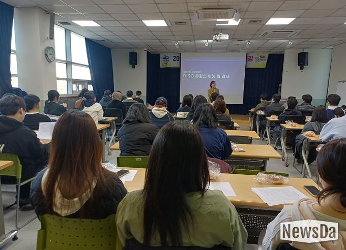 이번 특강에서는 성공적인 취업을 위한 자기 분석을 비롯해 공공기관, 공기업, 사기업의 직무 특성, DISC 행동유형 검사를 통해 자신에게 맞는 역할과 필요 역량, 인성 등을 탐색하는 시간을 가졌다.