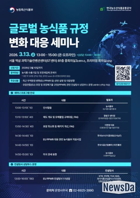 뉴스다 최광묵 기자 | 농림축산식품부는 유럽연합(EU)이 발표한 포장 및 포장 폐기물 규정(PPWR) 관련 우리 수출기업의 준비·대응을 위해 3월 13일 오후, K-푸드 수출기업 및 포장재 업계를 대상으로 서울 한국과학기술회관(ST센터)에서 ‘글로벌 농식품 규정 변화 대응 세미나’를 개최한다.