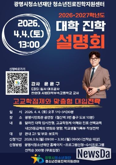 뉴스다 최광묵 기자 | 광명시청소년재단 청소년진로진학지원센터는 오는 4월 4일 광명시민회관 공연장에서 '고교학점제 시대와 맞춤형 대입전략'을 주제로 2026·2027학년도 대학진학 설명회를 개최한다.