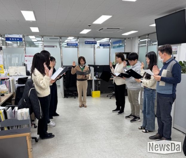 뉴스다 최광묵 기자 | 구리시 교문1동 행정복지센터는 지난 9일 민원인에게 더 친절하고 책임감 있는 행정서비스를 제공하기 위해‘민원 친절 다짐 선언’을 실시했다.