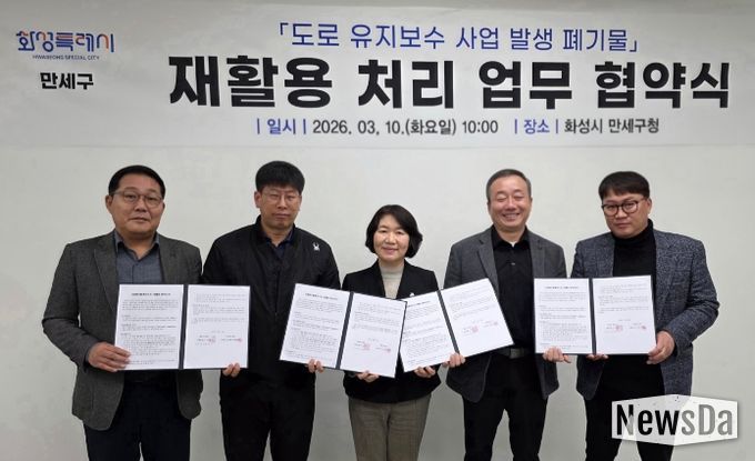 뉴스다 최광묵 기자 | 화성특례시 만세구가 도로 유지보수 과정에서 발생하는 폐기물을 효율적으로 처리하고 자원 재활용을 확대하기 위해 관내 아스콘 생산 업체와 ‘폐아스콘 재활용 처리 협약’을 체결했다.