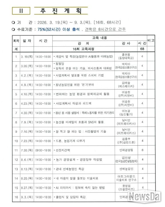 이번 청년농업인과정은 3월 19일 개강식을 시작으로 9월 3일까지 총 16회에 걸쳐 운영될예정이며 특히 변화하는 농업 환경에 발맞추어 청년농업인들이 현장에서 필요로 하는실질적인 지식과 기술을 전달하고 농촌의 안정적인 정착을 도모할 수 있는 다양한프로그램이 마련되어 기대를 모으고 있다.