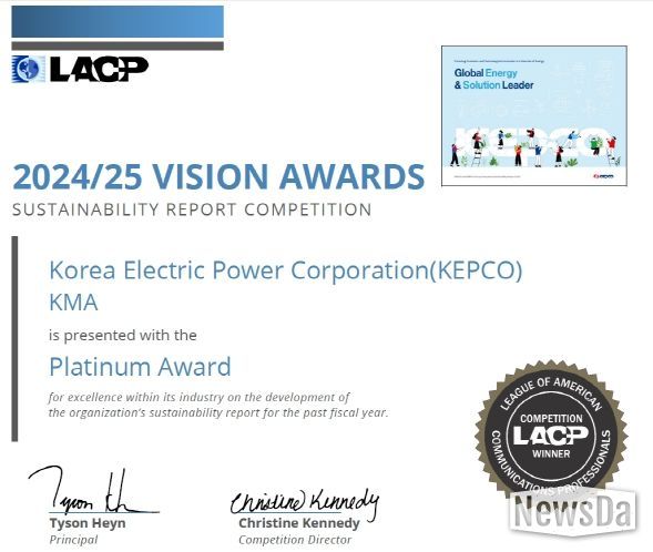 뉴스다 최광묵 기자 | 한국전력의 지속가능경영보고서가 미국 커뮤니케이션 연맹 LACP(League of American Communications Professionals)가 주최하는 '2024/25 비전어워드(Vision Awards)'유틸리티 분야에서 2016년 이후 10년 만에 최고 등급인'대상(Platinum)'을 수상했다.