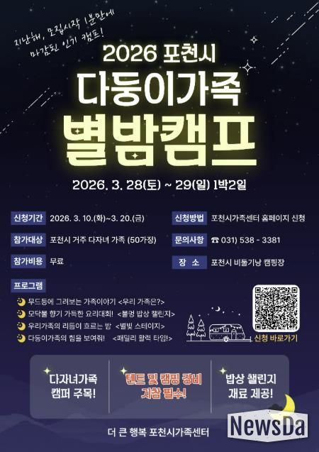 뉴스다 최광묵 기자 | 포천시 더 큰 행복 포천시가족센터는 다자녀 가족의 가족 친화 문화 참여 기회를 확대하고 가족 간 교류 활성화를 지원하기 위해 ‘2026 포천시 다둥이가족 별밤 캠프’ 참여 가족을 모집한다.